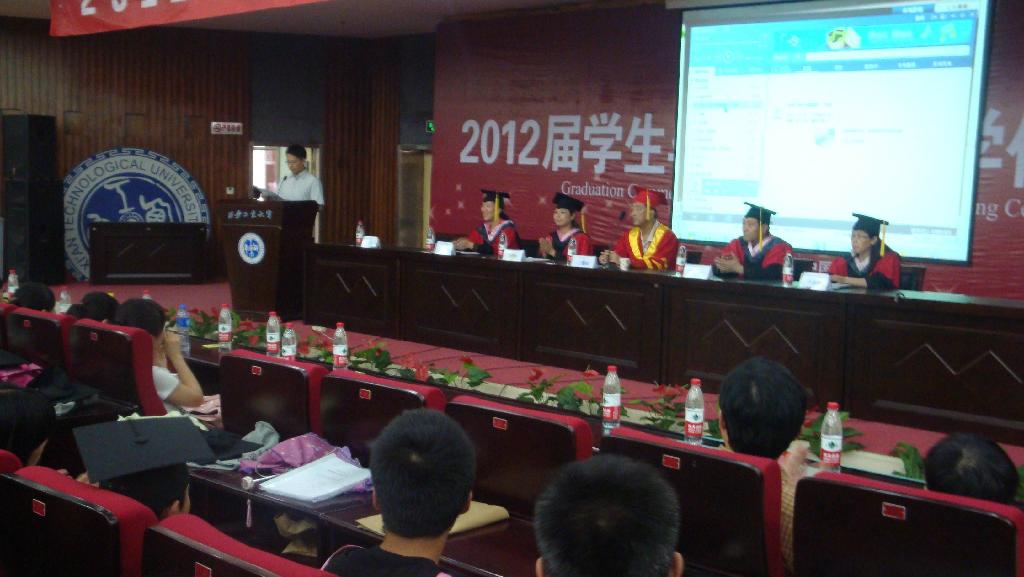 大会在国歌激昂慷慨、雄浑有力的旋律中开始。首先外国语学院副院长王蕙副教授介绍了西安工业大学本科毕业情况及学位授予情况,接着西安工业大学党委副书记丁养斌教授向2012届毕业生致辞,希望毕业生时刻以西安工大的光荣传统激励自己,在工作岗位上,为国家的繁荣做出应有的贡献。随后外国语学院副院长李雪梅教授宣读了优秀毕业生、三好学生、优秀学生干部名单;接着刘晓光副书记为外国语学院获奖学生颁发了证书,随后,优秀毕业生任娇同学代表全体毕业生对母校深表感激和祝福并代表全体毕业生赠送学院纪念品,祝愿母校明天会更好,家长代表也表达了对外国语学院老师们的衷心感谢和对毕业生的期望,教师代表王蓓老师回忆了与同学们在一起的点点滴滴,表达了对同学们的殷切希望和祝福;最后外国语学院院长、总支书记刘改琳宣读西安工业大学廉振民校长委托授权书,学院领导为毕业生拨穗合影。