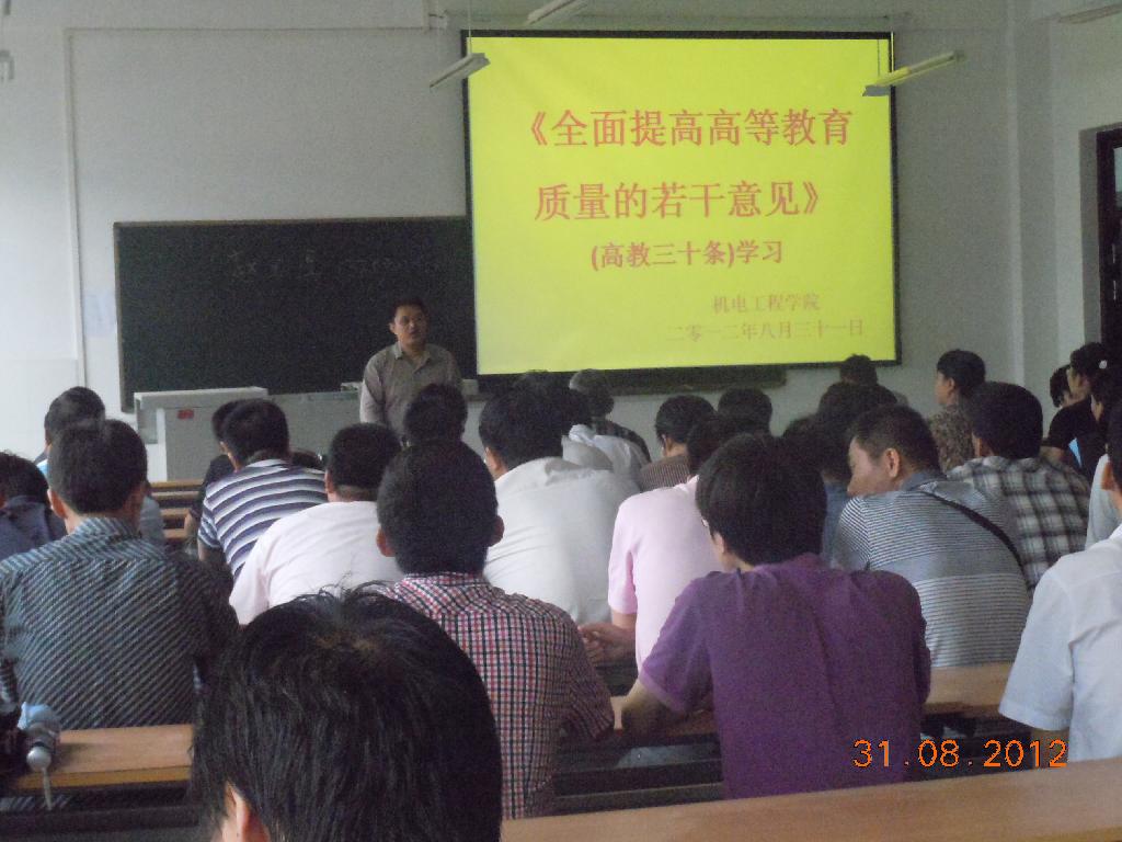 8月31日,为贯彻落实教育规划纲要和教育部《关于全面提高高等教育质量的若干意见》(简称“高教三十条”),机电工程学院于4B楼504教室召开学习大会。机电工程学院全体教职工参加了学习,机电工程学院党委书记赵玉厚出席会议并发表讲话。