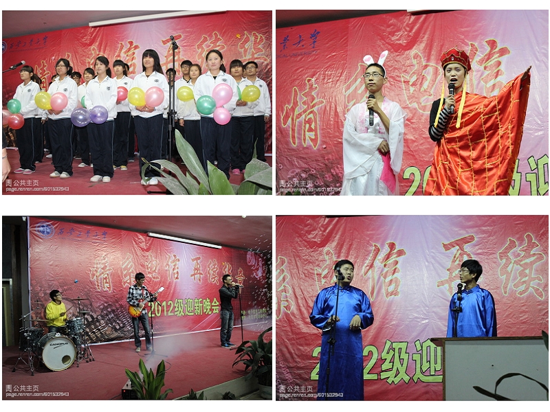 晚会开始,蒙古舞《马背上的骑手》展示着草原上骑手的奔放,相声《我的舍友》讲述了舍友之间有趣的故事,贴近新生,让新生们感受到大学生活的乐趣,大合唱《明天会更好》唱出了对明天更美好的期盼,唱出了对明天更美好的祝福。在中场节目中,进行了师生同台吃蛋糕的活动,把晚会的气氛带上了高潮,在师生欢聚的迎新夜晚,让大家感受到师生同乐的喜悦。下半场的节目更是魅力四射。街舞《show time》帅气的舞姿引来观众们连连叫好,高亢的《陕北民歌》让大家感受到了原生态歌曲的震撼力,舞台剧《嫦娥征婚记》中演员的独特的反串表演和幽默的举止将晚会再次推向高潮。电信学院12级老师班主任们带来的舞蹈《卓玛》更是赢得满堂喝彩。晚会在朗诵《我的祖国》和歌曲《国家》中完美落下帷幕。