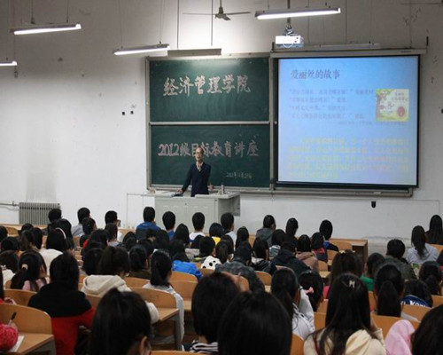 “人生的路很漫长,但关键的只有几步。”2012年10月23日晚,经济管理学院2012级目标教育讲座在教C205召开,讲座由经济管理学院党委副书记程新峰分两场为一年级向2012级全体新生进行讲授,学院曾灵秀老师和张洺铭老师参加了本次讲座。