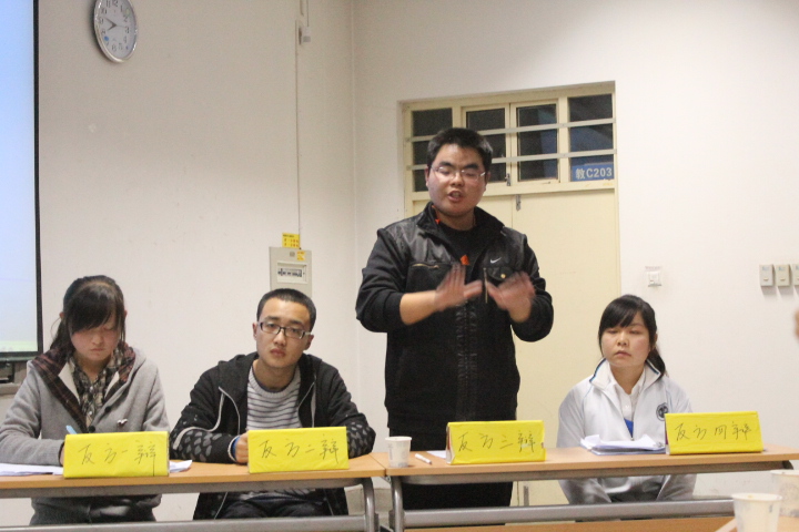 此次辩论赛为期两周,由12级新生组队参加,经过初赛、复赛的激烈对决,遴选出8位优秀辩手。本场辩论赛,这8位辩手就“在校大学生创业利大于弊还是弊大于利”这一辩题进行精彩对决。王睿、王欢、刘育玮、唐沙组成正方,闵睿、刘佳奇、叶夏远、宋艳戎组成反方。