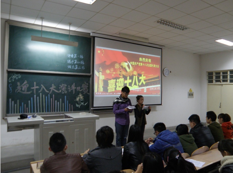 党的十八大胜利闭幕,为了深入学习和贯彻党的十八大精神,11月19日晚7点,西安工业大学艺术与传媒学院以“重温经典,喜迎十八大”为主题的演讲比赛在未央校区教学楼B501顺利举行。