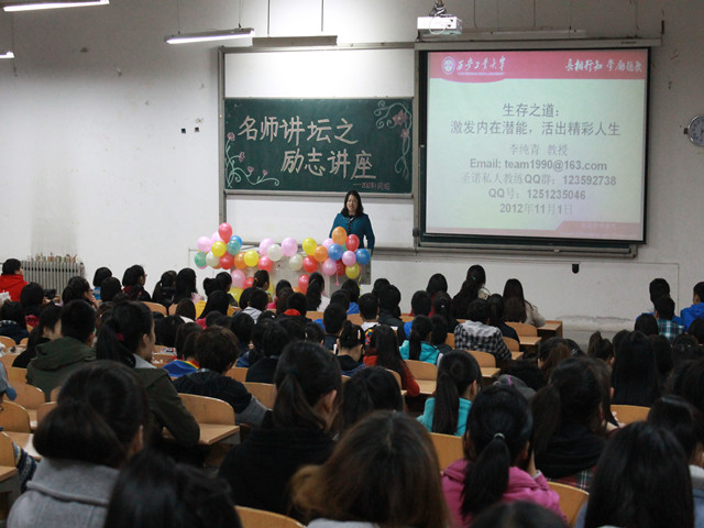 清华大学博士后、经济管理学院院长李纯青为2012级学生做了题为《大学生存之道》的励志讲座。李纯青院长简要介绍了自身的教育经历和从业经历,以生动的视频和精彩的案例,阐述了什么是生存之道,什么是生存的价值以及怎样实现生存价值等问题;期间,她提出了“积极心态十一条”,使大家受益匪浅。从如何面对人生挫折到大学生活的规划,从心态的转变与积极心态的培养,李院长用激动人心却不失风趣幽默的语言, 与大家进行了一次真诚的交流,赢得了同学们的阵阵掌声。