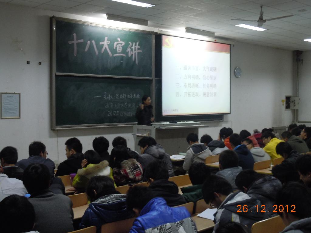 西安工业大学十八大精神宣讲团成员、思政部主任田亮教授于2012年12月26日在未央校区教C105为机电工程学院做了题为“十八大理论创新”的专题宣讲,机电工程学院全体党员、预备党员、入党积极分子和学生干部代表共300余人聆听了宣讲报告。