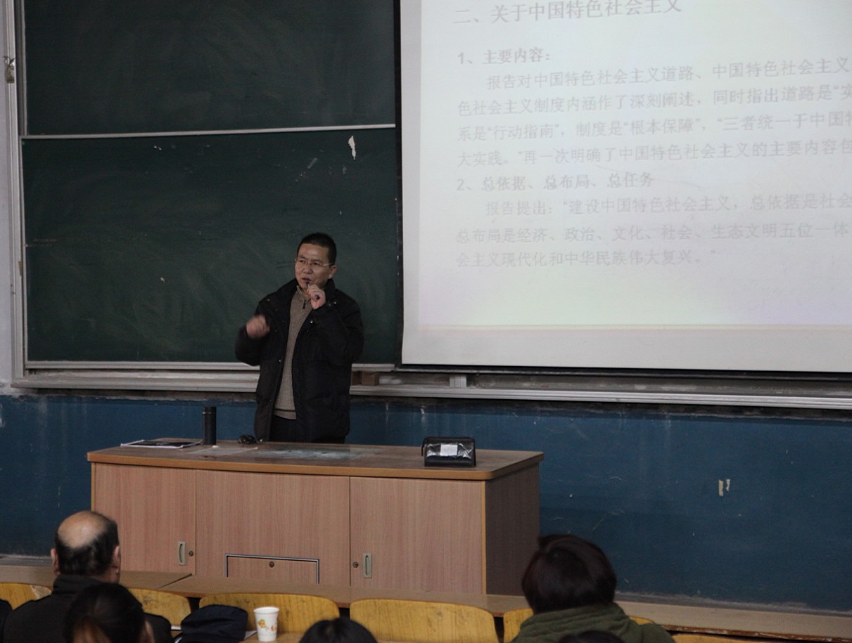 王苏喜教授从党的指导思想、中国特色社会主义、中国特色社会主义经济建设、中国特色社会主义政治建设、中国特色社会主义文化建设、中国特色社会主义社会建设、中国特色社会主义生态文明建设、党的建设和二十一世纪中国的“三大目标”和“三大台阶”等九个方面,全面解读了十八大报告的精神内涵。王教授结合丰富的实证、运用生动的语言,使报告会充满理论高度,又不乏直观的形象性,极富感染力和吸引力,给全院师生党员深入理解和把握党的十八大精神很大的启发和帮助 。