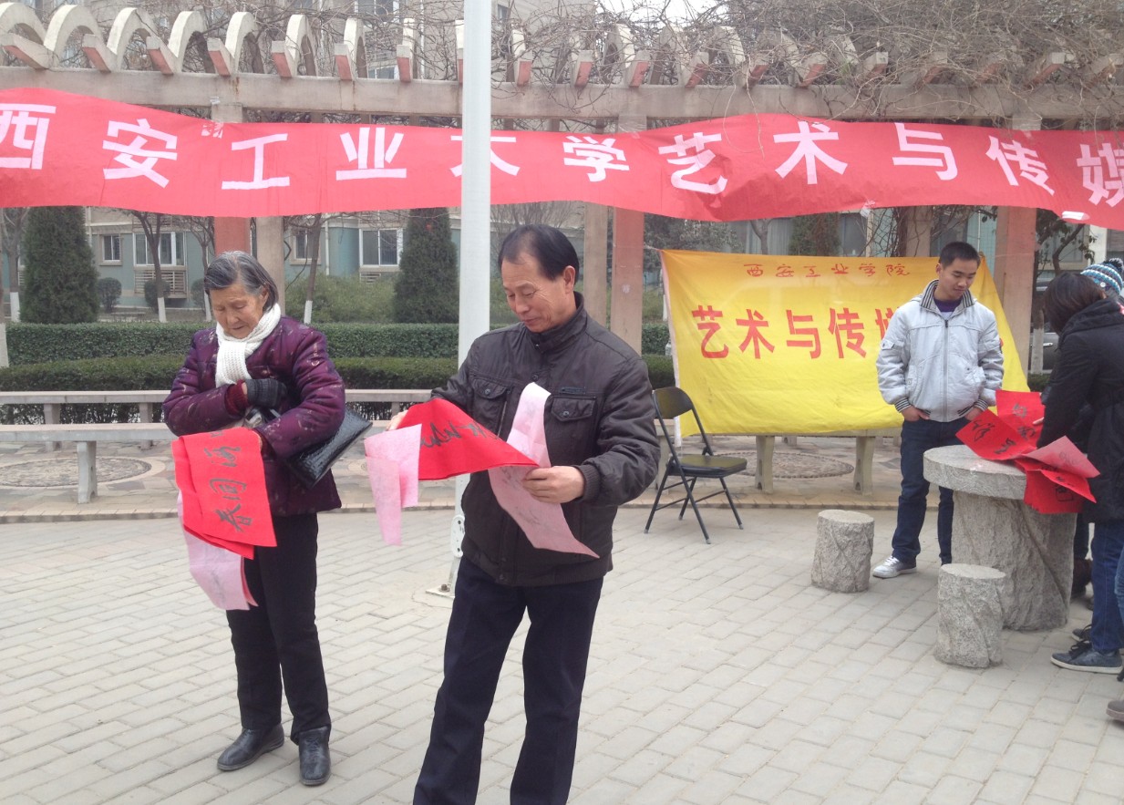 在中华民族的传统佳节—春节,即将到来之际,西安工大艺术与传媒学院学生与校青年志愿者协会同学,一同走进西安市未央区百信家园小区,通过送春联的形式向社区居民送上我校大学生对社区居民的新春祝福。