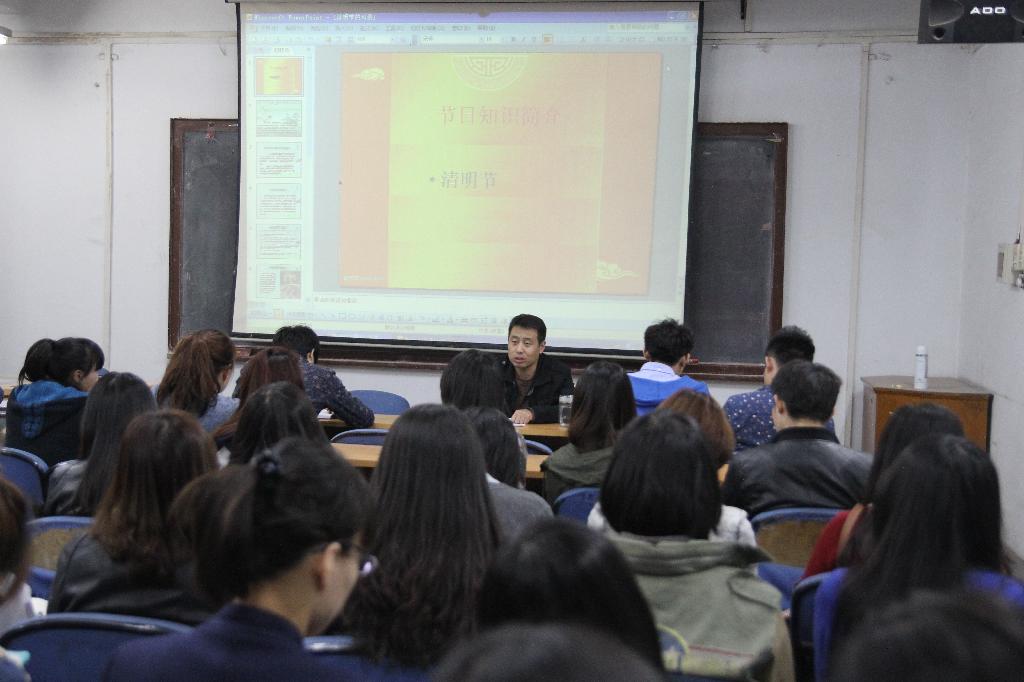 为了进一步加强同学们对中国传统文化的理解和认识,以提高我院全体同学的思想道德素质。2013年4月10日晚7点,艺术与传媒学院在教3楼多媒体教室举办中国传统文化习俗讲座第二讲清明节起源及民俗文化。此次讲座由我院团委书记张晓宾老师主讲,我院全体学生干部聆听了此次讲座。