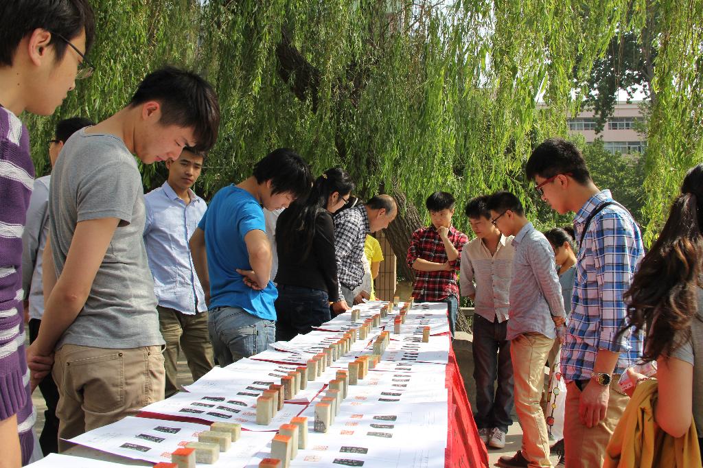 为丰富校园文化生活,弘扬篆刻文化、普及印章知识,2013年4月17日下午由我院学生会和书法专业联合举办的“书法篆刻”作品展在金花校区图书馆门前如期举行。我院团委书记张晓宾、2011级辅导员杨娜娜,书法专业老师常栓怀、雷雨、刘天琪前来参观指导。