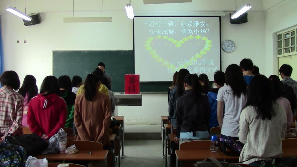 4月26日上午8点02分,外国语学院在教A403举行 “团结一致,心系雅安;众志成城,情系中华”抗震救灾募捐仪式。一方面,为雅安灾区伸出援助之手,贡献爱心。另一方面积极落实我院安全教育工作,强化学生安全意识,提高避险能力。