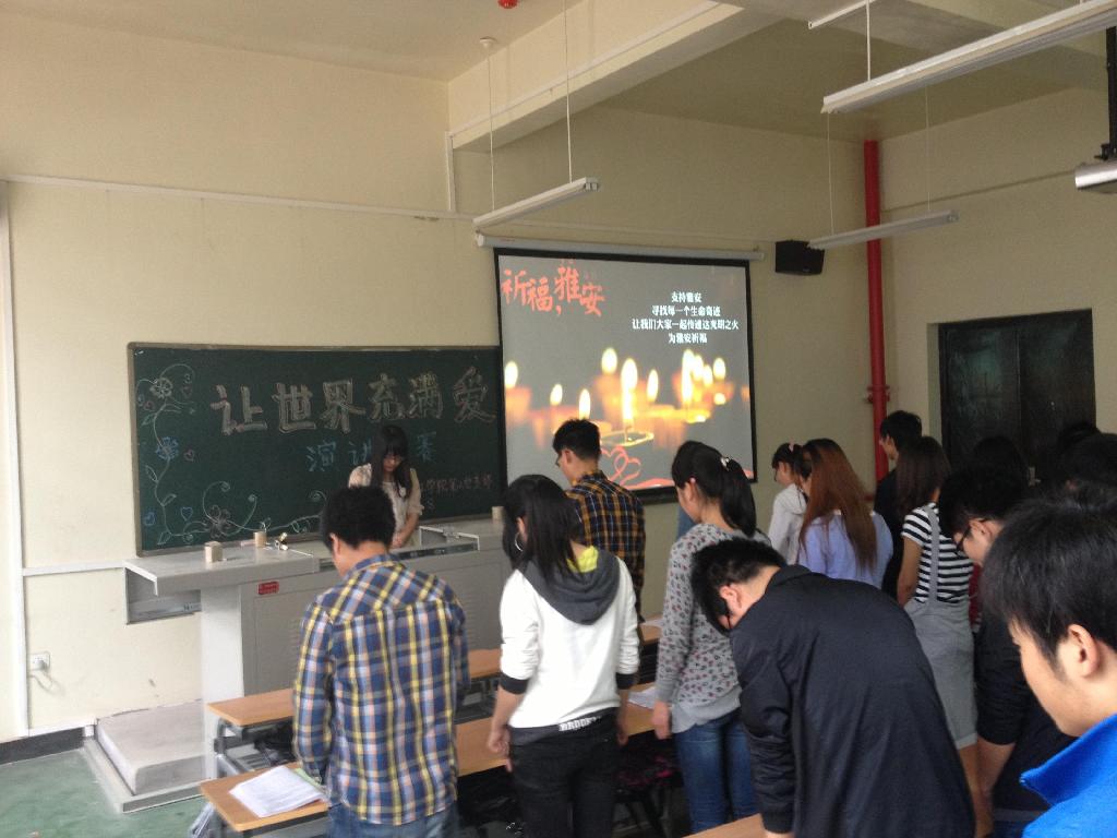 比赛开始前,全体参赛选手与工作人员首先为四川汶川以及雅安同胞进行了祈祷。演讲比赛主要围绕“中国梦”和“感恩”两个话题进行,参赛选手感情饱满,热情洋溢。通过激烈的角逐,王剑桥等同学分别获取一、二、三等奖。