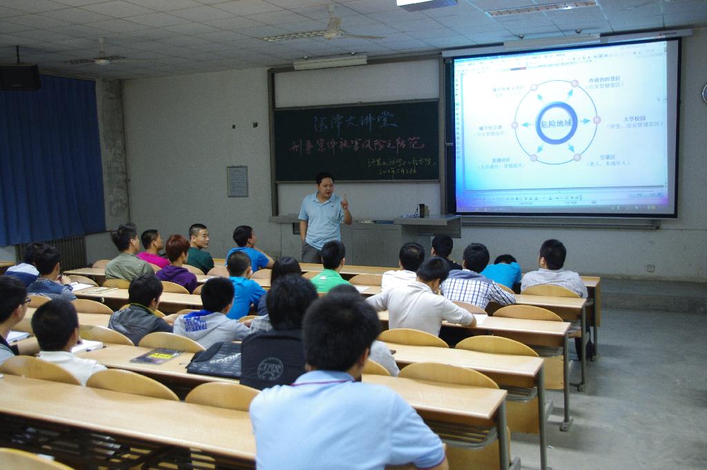为了使我校大学生树立法律意识、增强法制观念,健康快乐成长。2013年5月27日晚,由学生处主办、计算机学院承办的法律大讲堂知识讲座在教C102教室举行。此次法律讲座以“刑事案件被害风险之防范”为主题,由人文学院王锋老师主讲。