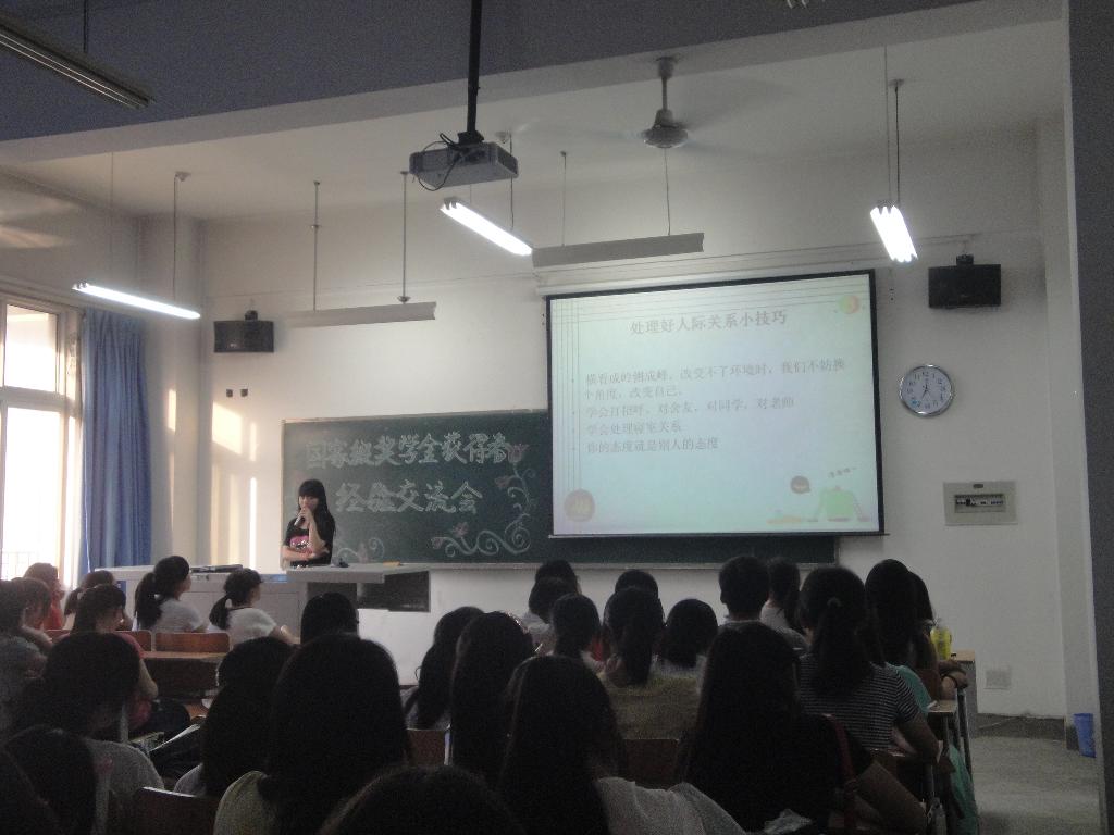 晚风习习,在这个缤纷的季节,经济管理学院国家级奖学金获得者经验交流会于2013年6月7日晚7点在教A302精彩放送。我院国家级奖学金获得者李正恬、毕丹学姐及魏康学长参加了本次交流会。