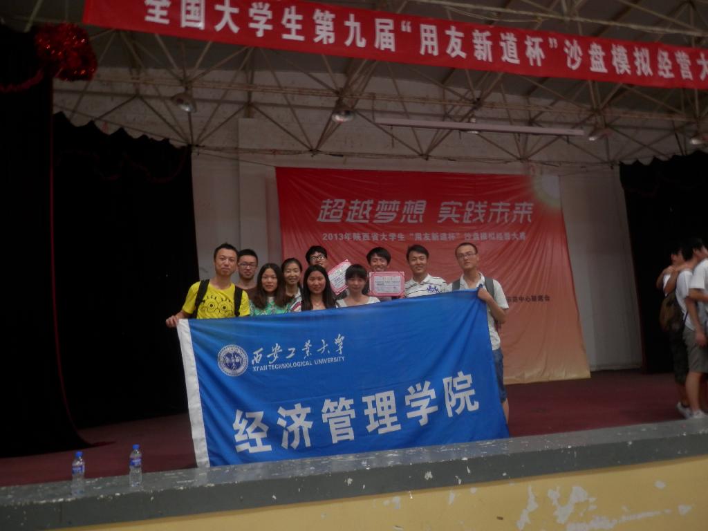 本次大赛由高等学校国家级实验教学示范中心联席会和用友新道公司主办,西安科技大学承办,来自陕西省20多所高校的40支代表队、200余名选手和指导教师参加了比赛。西安工大代表队由经济管理学院兰小毅老师和程新峰老师带队、十名同学参赛,经过激烈角逐,西安工大两支队伍分别以高分在两组比赛中取得一等奖。
