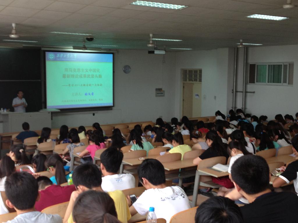 6月14日下午13:30,在教C203,外国语学院党总支部书记张文孝为学院全体学生就党的十八大报告的学习贯彻,作了题为《用马克思主义中国化最新理论成果武装头脑》的辅导报告。