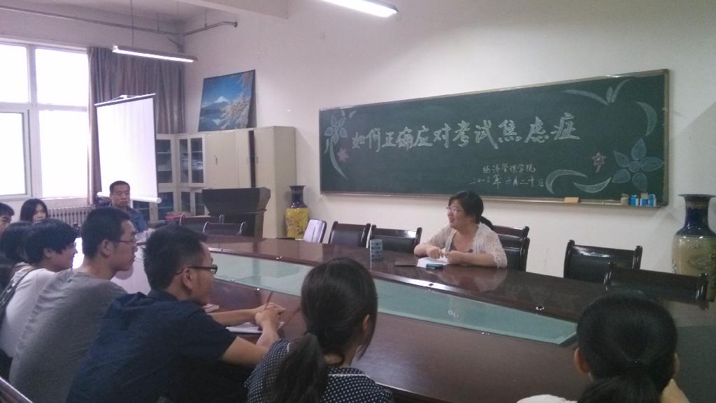 为了缓解学生的考前紧张情绪,消除学生的考前焦虑症,针对部分学业压力大、考试焦虑情绪较明显的学生,经济管理学院2013年6月20日晚6时举办了主题为“如何正确应对考试焦虑症”的团体心理辅导,本次辅导由经管学院心育员张玉玲老师主讲。