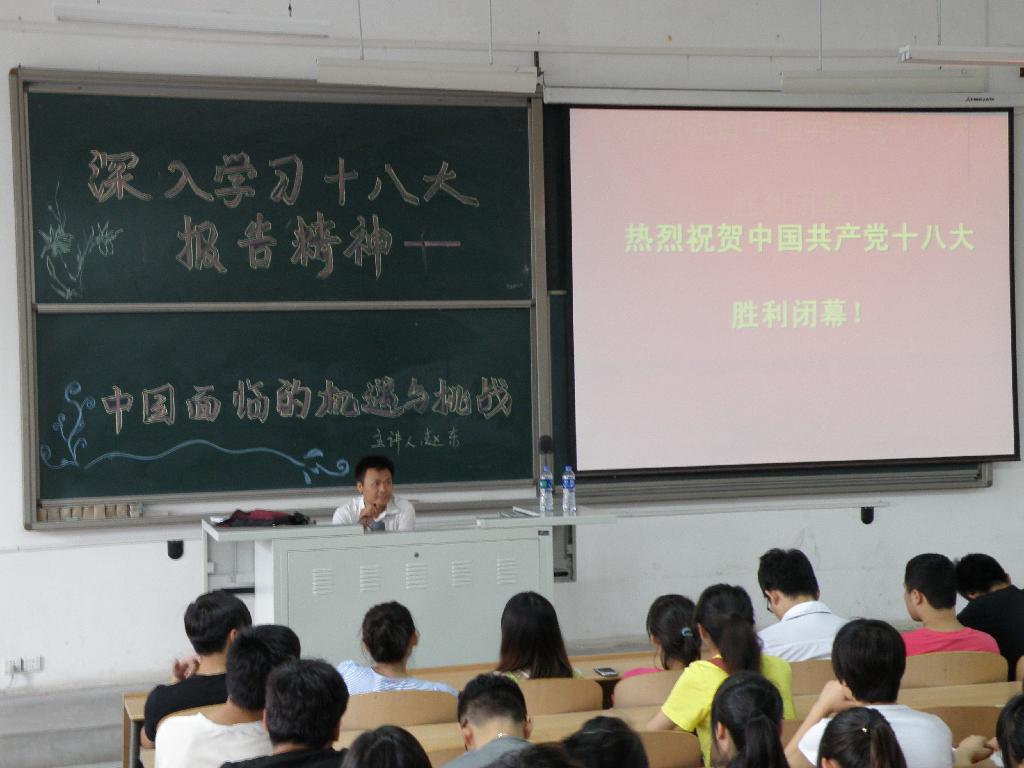 赵东老师以十八大精神为主旨,分别从“中国特色社会主义道路建设”,“核心价值观”以及“三型目标”这三方面深入讲解了十八大的精髓。在阐述中国特色社会主义经济、政治、文化及生态建设的论述和部署中,赵老师着重讲解了文化建设。文化是民族的血脉,为了实现中华民族伟大复兴,必须推动社会主义文化大发展大繁荣,提高国家文化软实力,发挥文化引领风尚、教育人民、服务社会、推动发展的作用。随后赵老师对十八大报告提出的核心价值观做了详述,富强、民主、文明、和谐,自由、平等、公正、法治,爱国、敬业、诚信、友善这24个字完整的概括了社会主义核心价值观。价值观是人们心中的深层信念系统,核心价值观能否与时俱进,直接影响到一个国家的凝聚力和影响力。紧接着赵老师进一步解读了党的十八大报告提出的建设学习型、服务型、创新型的马克思主义执政党,这“三型目标”,表明我们对执政党建设规律的把握更自觉、更全面、更深刻。在党的十八大报告中,人民是个关键词,服务也是个关键词。坚持人民主体地位,更好保障人民权益、更好保障人民当家做主贯穿报告始终,为人民服务也贯穿报告始终。
