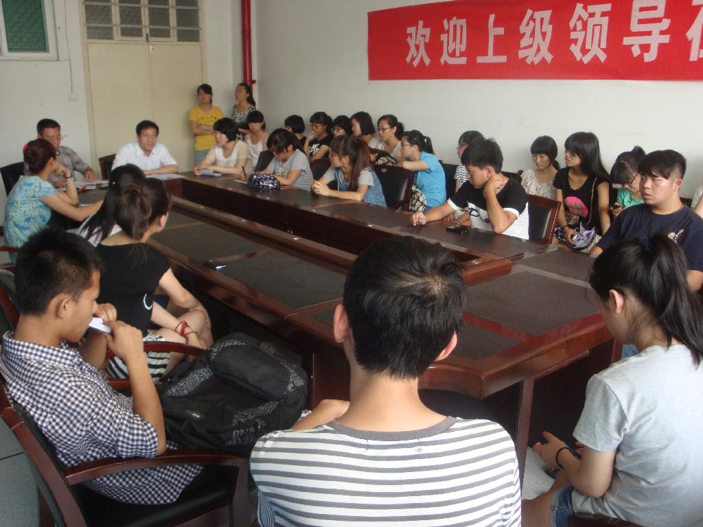 7月5日上午10:30,在教E414,外国语学院党总支书记张文孝、副书记刘晓光主持召开了外国语学院2012级学生军训动员大会。辅导员李娟、范亚苗参会。