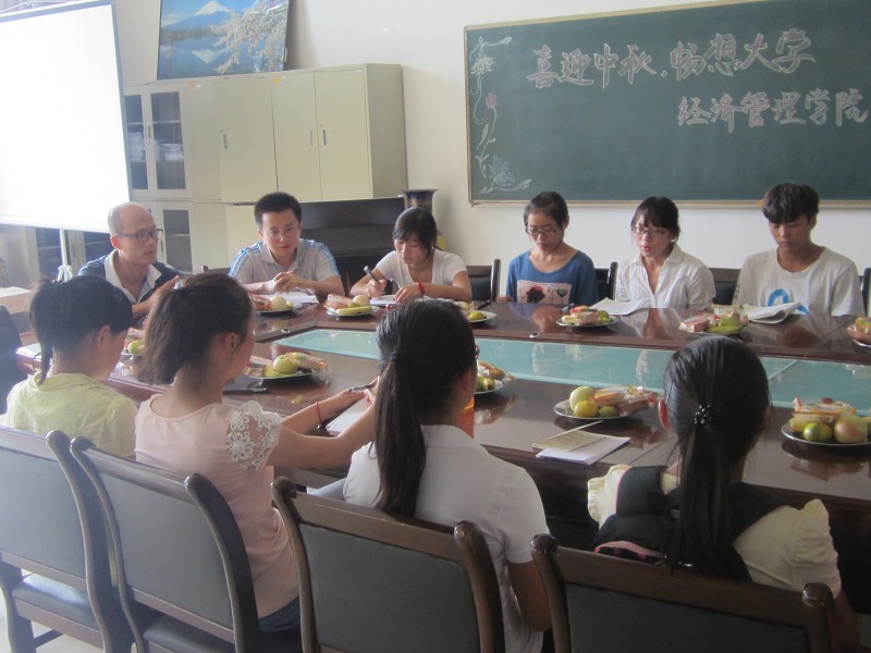 9月18日下午,经济管理学院在教5-505召开了别开生面的“喜迎中秋,畅想大学”师生座谈会。党委副书记程新峰老师及辅导员赵伟老师、周晨老师一并出席。经济管理学院2011级4位优秀学生以及2013级12名家庭经济条件困难代表参加了本次座谈会。