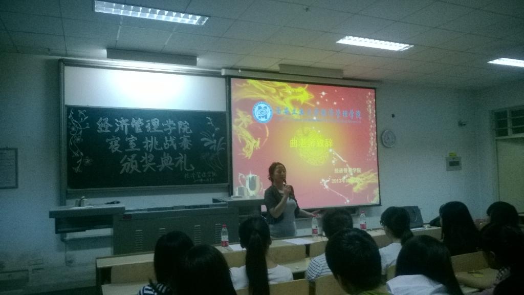 挑战赛在主持人的致辞中拉开帷幕。部分获奖寝室的代表发表了演讲,以ppt的形式,分别从专业学习、英语四六级、计算机等级、学科竞赛等方面向大家介绍了各自的经验,展示了在寝室挑战赛中各自所取得的辉煌成绩及寝室风采。图文并茂搭配各自的精彩小故事深深感染了大家,使人们沉醉其中。精彩寝室风采展示之后就是激动人心的颁奖典礼。程书记和曲书记分别给优秀的获奖寝室颁发奖品和证书。最后由曲书记做总结致辞,整个颁奖典礼在阵阵掌声中结束。