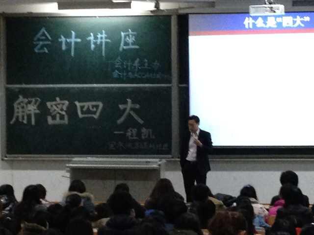 讲座中,史老师对程凯经理的到来表示欢迎,并给大家介绍了程凯的教育经历和职场经历。之后,程凯老师进入讲座主题,四大会计师事务所是指指世界上著名的四个会计师事务所,也就是普华永道(PWC)、德勤(DTT)、毕马威(KPMG)、安永(EY),他们在会计行业中起着举足轻重的作用。随着讲座的深入,程老师深入分析四大会计事务所的业务模块,使同学们对国际业务和中国业务有了鲜明的认识,并从内部晋升体制方面,以安永会计事务所为例,阐述了四大会计事务所与一般企业晋升制度的区别。