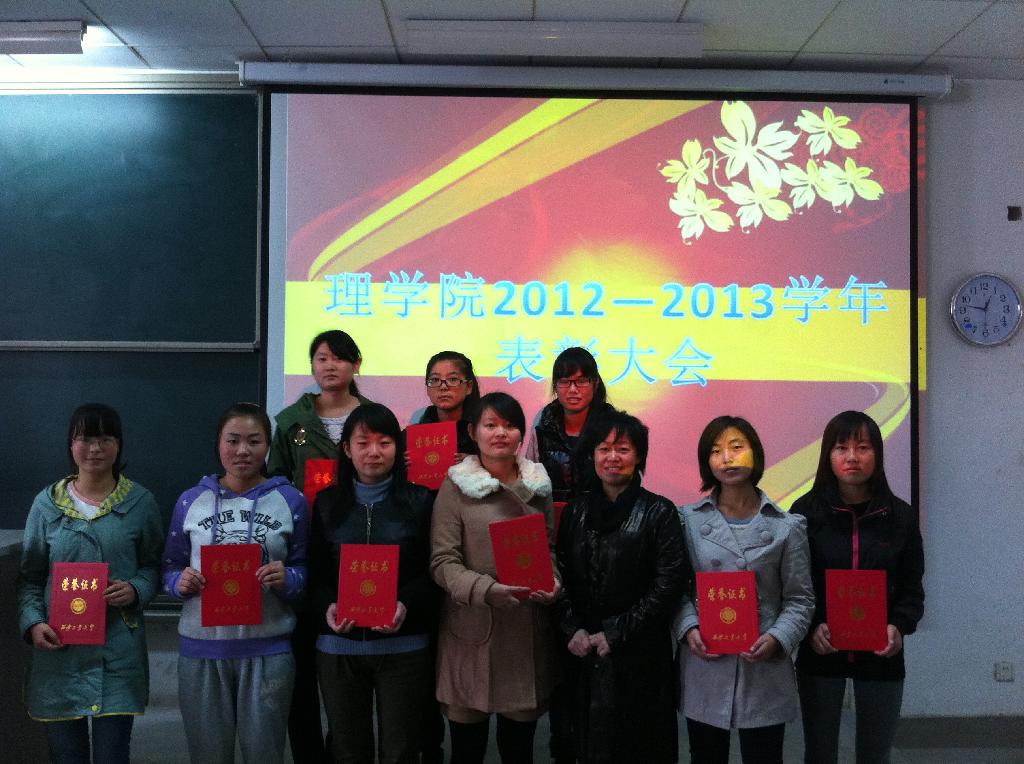 理学院副院长李选民教授宣布表彰决定,共有1个三好班级、1个优良学风班、2个文明宿舍、11名优秀学生干部、26名三好学生、148人次奖学金获得者受到了表彰。随后,院领导为获奖集体和学生颁发了荣誉证书并合影留念。