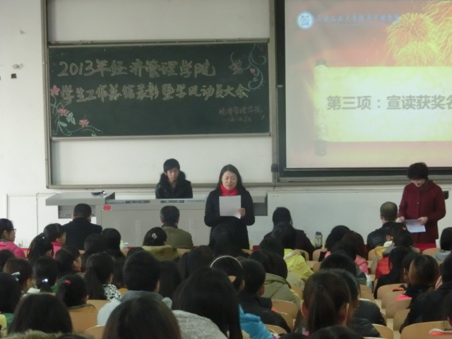 11月27日,我院2013 年学生工作总结表彰暨学风动员大会在教1-205举行。院党委书记曲敏、院长李纯青、副院长宋元梁、副院长谢立仁、院党委副书记程新峰出席大会。