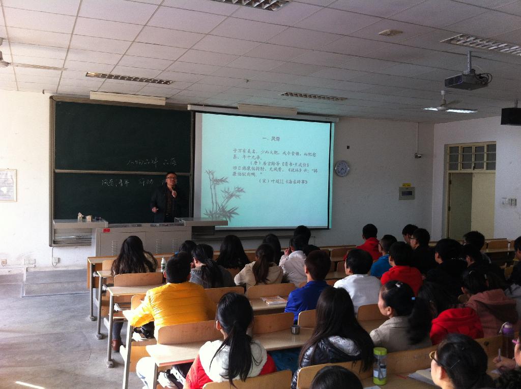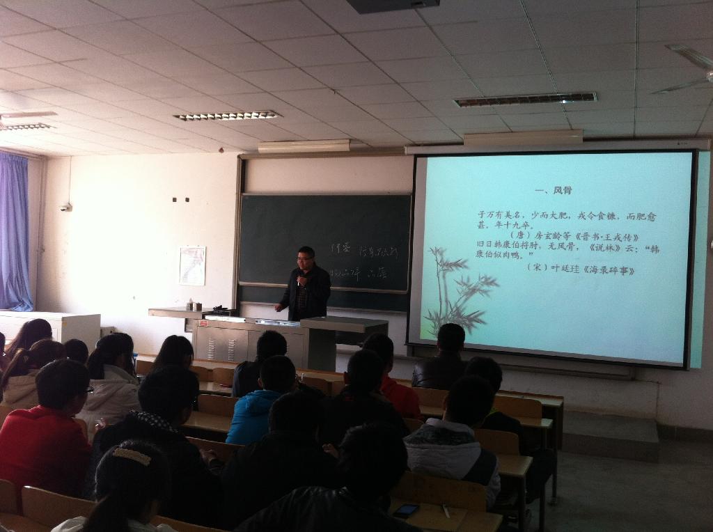 11月26日下午,人文学院中文系主任程建虎副教授在教2—303为理学院师生开展了一场题为《中国文学与文化——魏晋风度与六朝文化》的精彩讲座。理学院团委书记王娟老师,辅导员周俊老师与13级理学院同学共同参加了本次讲座。