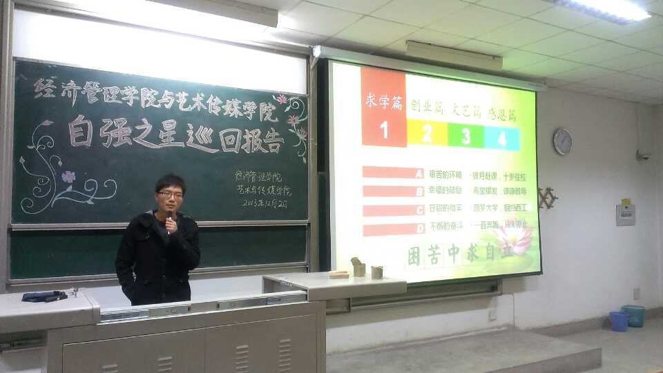 12月2日,由经济管理学院与艺术传媒学院联合主办的2013“自主自强,放飞梦想”自强之星巡回报告会在我校教2-202成功召开。本次报告会由西安工业大学选出的“自强之星”学生代表担任主讲。来自经管学院、艺传学院的教师代表和受资助学生代表听取了本次报告会。