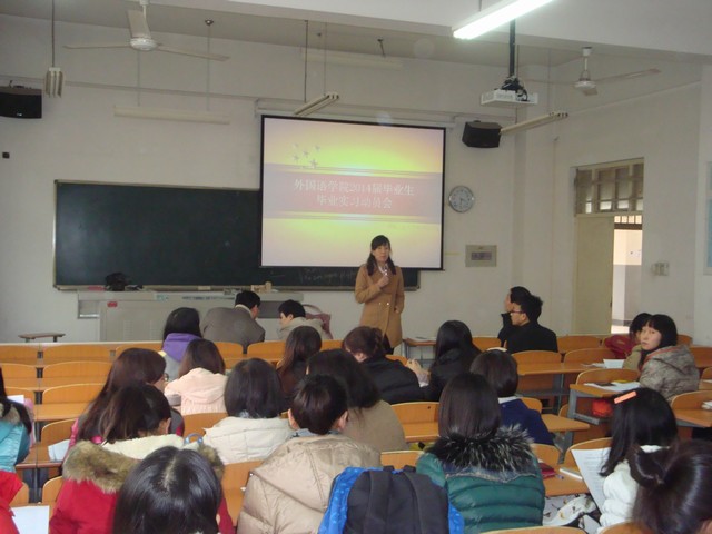 2013年12月4日下午,外国语学院在教3-202召开2014届毕业生实习动员会和安全教育会。外国语学院党总支副书记刘晓光、教学副院长王蕙、专业教研室主任张郁和陈建明、辅导员陈瑞哲参加会议。