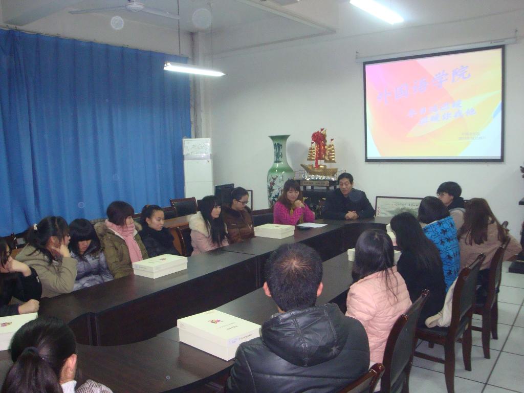 12月25日晚,外国语学院刘晓光副书记、辅导员王丹丹老师和同学们在教5-413举行了外国语学院“冬日送温暖,温暖你我他”活动,为外语学院7位特困学生送上了我校购置的高档保暖内衣。热心的关怀,亲切的叮咛和保暖内衣温暖了每一个学生。