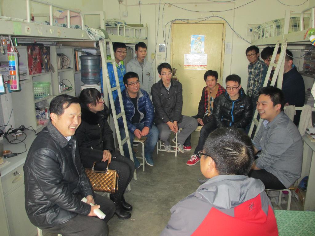 2014年2月23日,材料与化工学院院长李建平教授进入四公寓603、610、611男生宿舍,就学生的学习生活进行深入地交流。