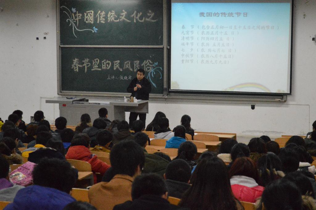 为了弘扬民族精神、传承中国文化,扩展并加深同学们对中国传统文化的理解。西安工业大学艺术与传媒学院于2014年3月6日晚6点在未央校区教1-205举办中国传统文化系列之 “春节里的民俗民风”讲座。讲座由张晓宾老师主讲,艺术与传媒学院2012级、2013级学生聆听了讲座。
