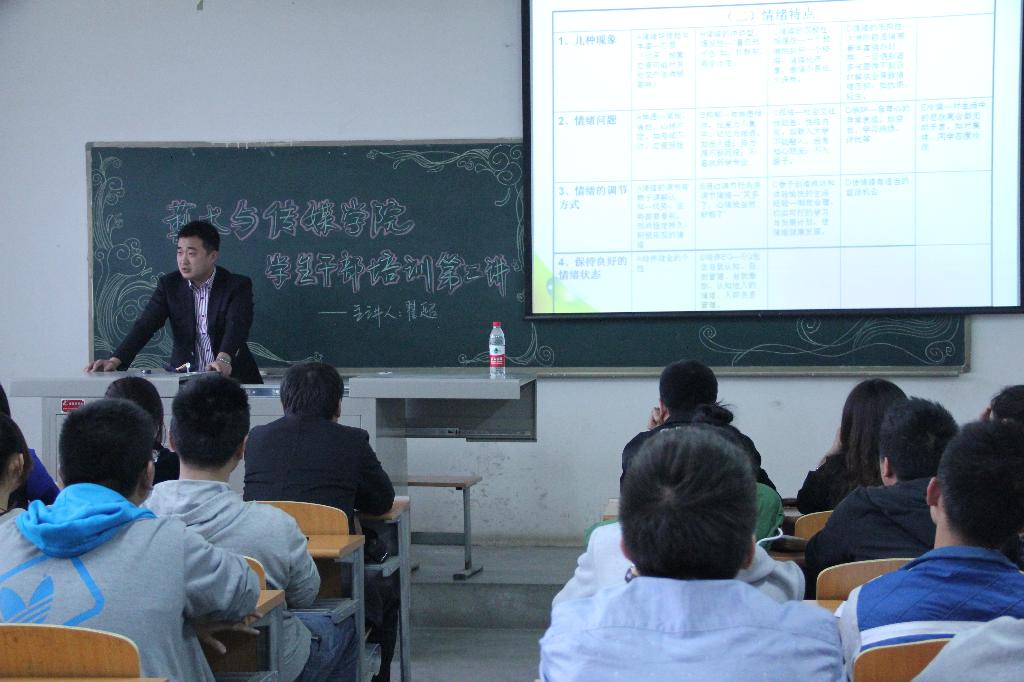 为了更进一步提高我院各个学生干部的个人素质及管理能力,使我们学生会的工作更加规范和有序开展,在学生干部培训第一讲成功举办之后,2014年4月02日晚18:00,西安工业大学艺术与传媒学院在教3-407教室举办了学生干部培训第二讲。本次讲座由我院团委书记张晓宾老师主持,西安工业大学团委组织部部长翟超老师主讲,我院所有学生会干部聆听了本次讲座。