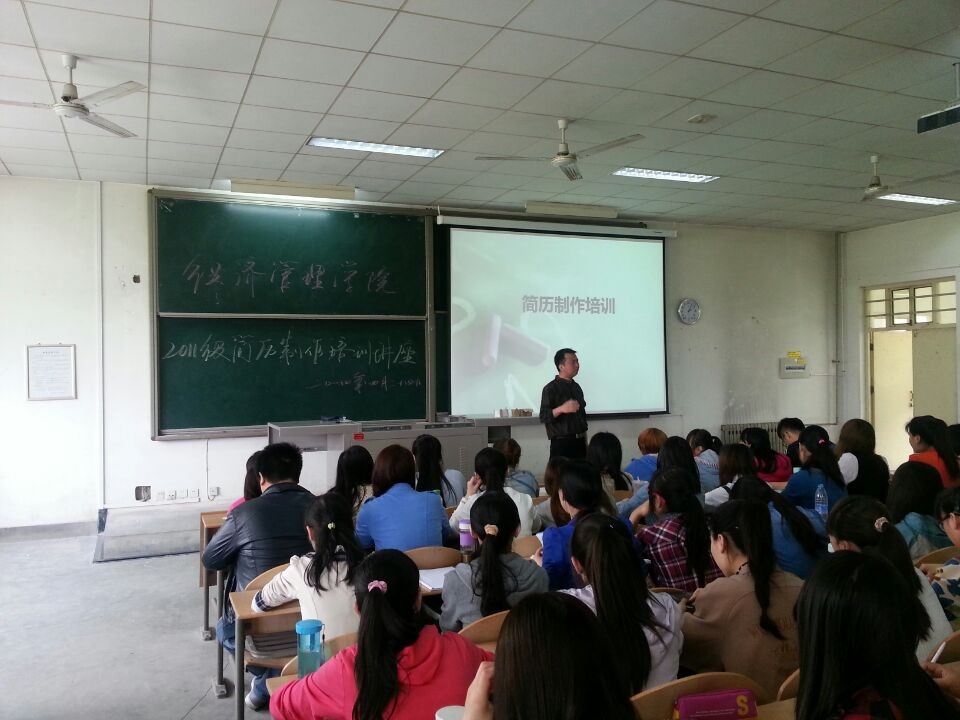 4月24日,经管学院2011级在教1-101教室举办了简历制作培训讲座,本次讲座特地邀请经管学院人力资源管理系主任李明老师主讲。2011辅导员张玉玲老师、原玲老师和2011级找工作目标小组的学生参加了本次讲座。