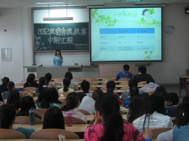 汇报会伊始,两位辅导员致辞,重申宿舍挑战赛的意义和作用,肯定自本次活动开展以来,各个宿舍的积极表现,并在年级宿舍中起到了良好的示范作用,希望2012级以宿舍挑战赛为契机,推动全年级良好学风、进取班级以及温馨舍风的形成。随后,各宿舍代表纷纷通过精美的PPT,展示自开赛来整个宿舍在学习、生活等方面的提高与进步,同时也认真的指出了其中的不足,以及对赛初制定目标的完成情况。综合表现良好的宿舍在向着更高、更好的目标迈进;综合指标不理想的宿舍也进行了认真的反思总结,汲取他人意见,重整旗鼓,力争取得更好的成绩。
