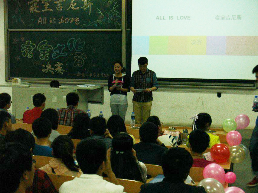 2014年5月12日、14日两天,机电工程学院在经纬广场和教3-217隆重举办了以“All Is Love”为主题的第三届寝室吉尼斯大赛。此次大赛面向全校大一学生,活动共设有如下4个环节:自行车慢骑、急速乒乓、极限接力、寝室风采。