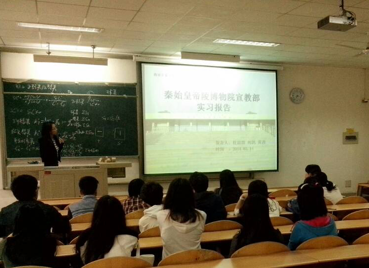 报告会伊始,黄倩同学向同学们介绍了他们此次去兵马俑实习的实习项目、实习内容、注意事项以及在实习过程中衣食住行等各方面的事项。接着韩鸽同学向大家解读了自己在实习过程中的感悟与收获,用生动有趣的例子向大家分享了他们在兵马俑实习时的快乐与烦恼,并且告诉同学们在做导游时应该注意的各种事项,特别是要提前备好解说词。最后,同学们向两位学姐询问了自己在实习方面有兴趣和有疑问的事项,韩鸽和黄倩同学都能够通过事实实例一一进行解答,给同学们满意的答案。