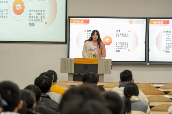为进一步加强校院两级易班、新媒体中心学生团队学习交流,提升网络思政学生骨干的创作能力和运营技巧,使校院之间、各院之间形成相互学习、相互支持的工作氛围,校网络思政中心特发起“琢玉优创”网络思政工作实务培训交流系列活动。11月17日晚18点30在教2-109开展了《第五期:活动的策划与实施》。经前期报名和精心组织,共有来自各学院的100余名学生现场参与培训和交流。