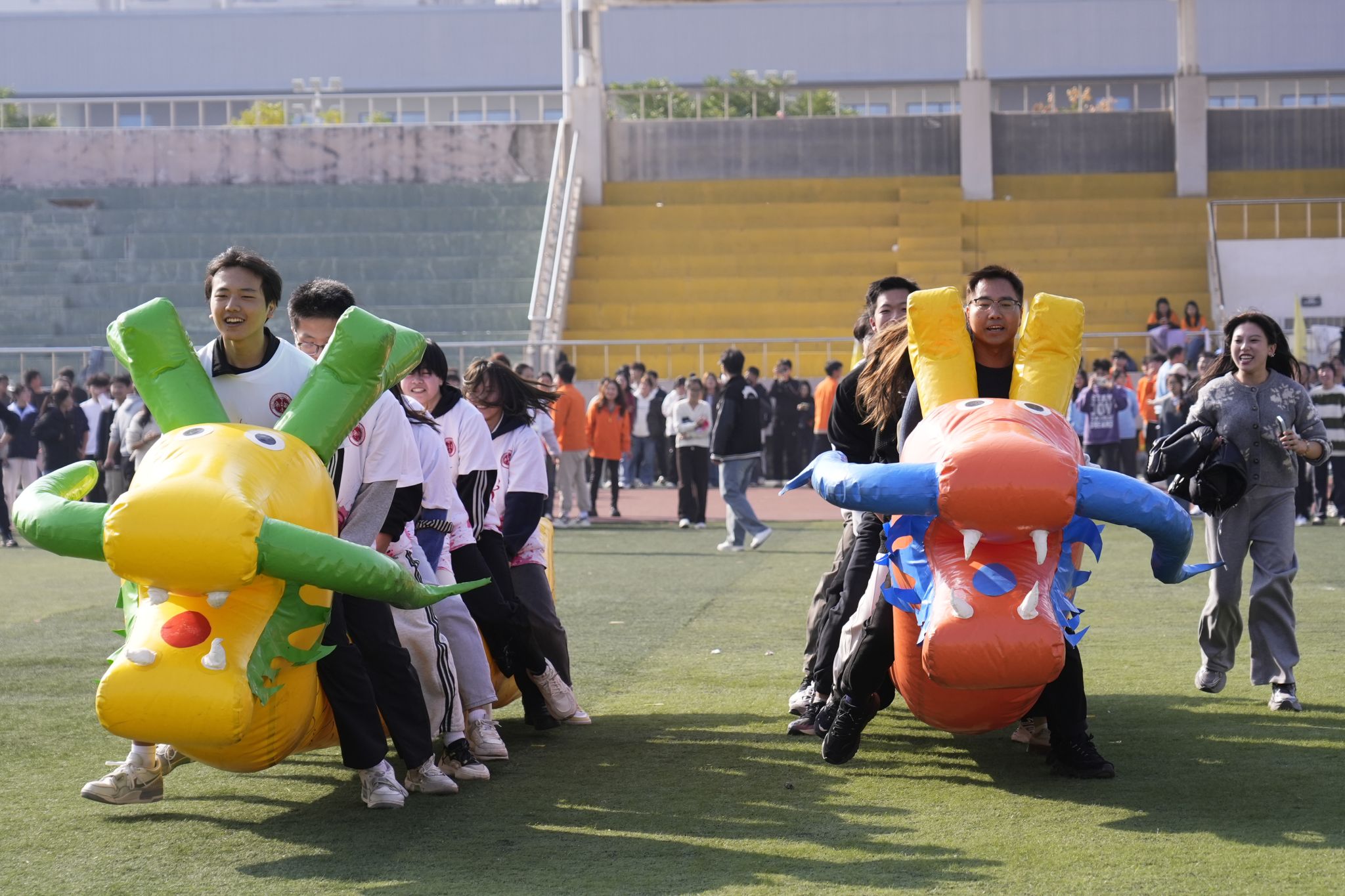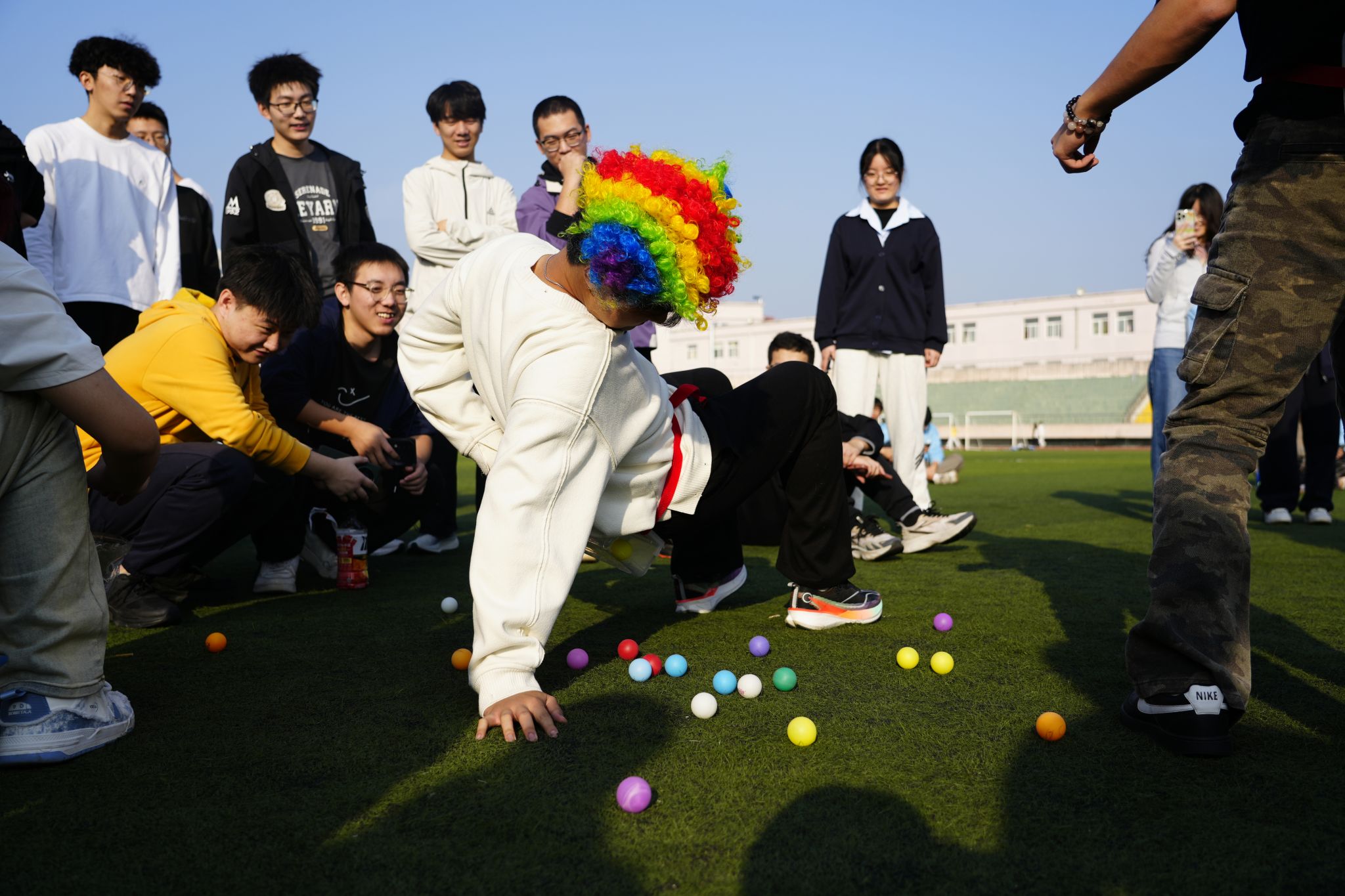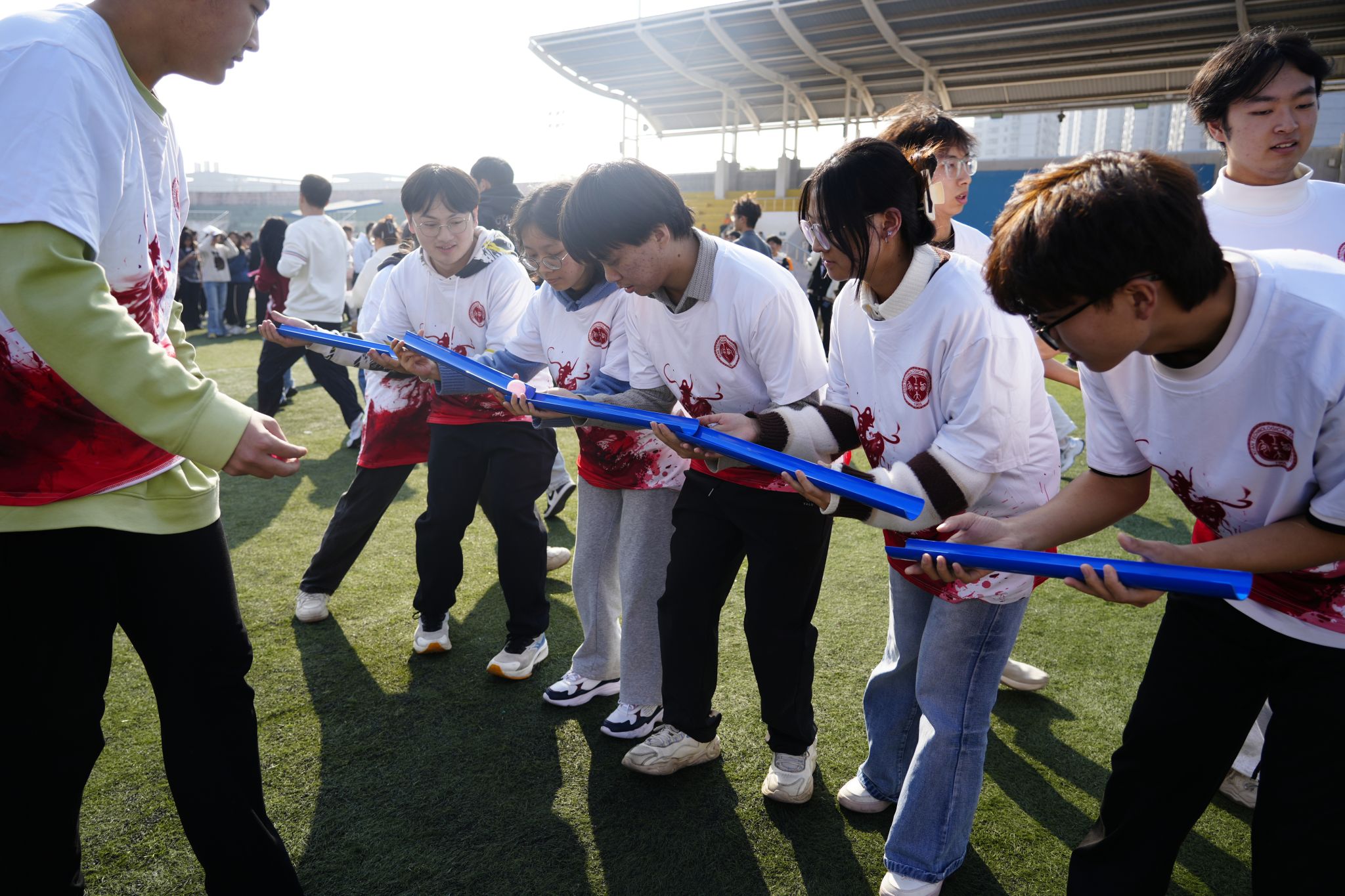 伴随着动感洋溢的集体热身操,运动场瞬间变为跃动的海洋。本次运动会巧妙融合竞技性与心理成长性,精心设计了“旱地龙舟”“公鸡下蛋”“珠行千里”“旋风奔跑”集体项目,以及“逆风奔跑”“趣味投壶”“天旋地转”“蒙眼踏步”个人挑战项目。赛场上,选手们奔跑、跌倒、调整、再出发,不仅展现了拼搏的身姿,更在协作与突破中完成了一次次心灵的对话。场边掌声、欢呼声此起彼伏,每一句鼓励都成为选手们勇往直前的力量。