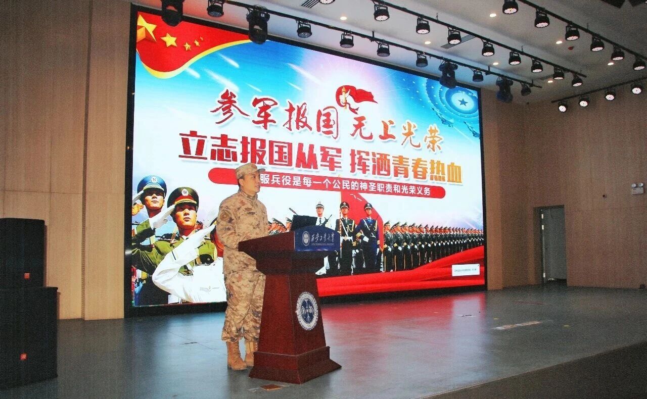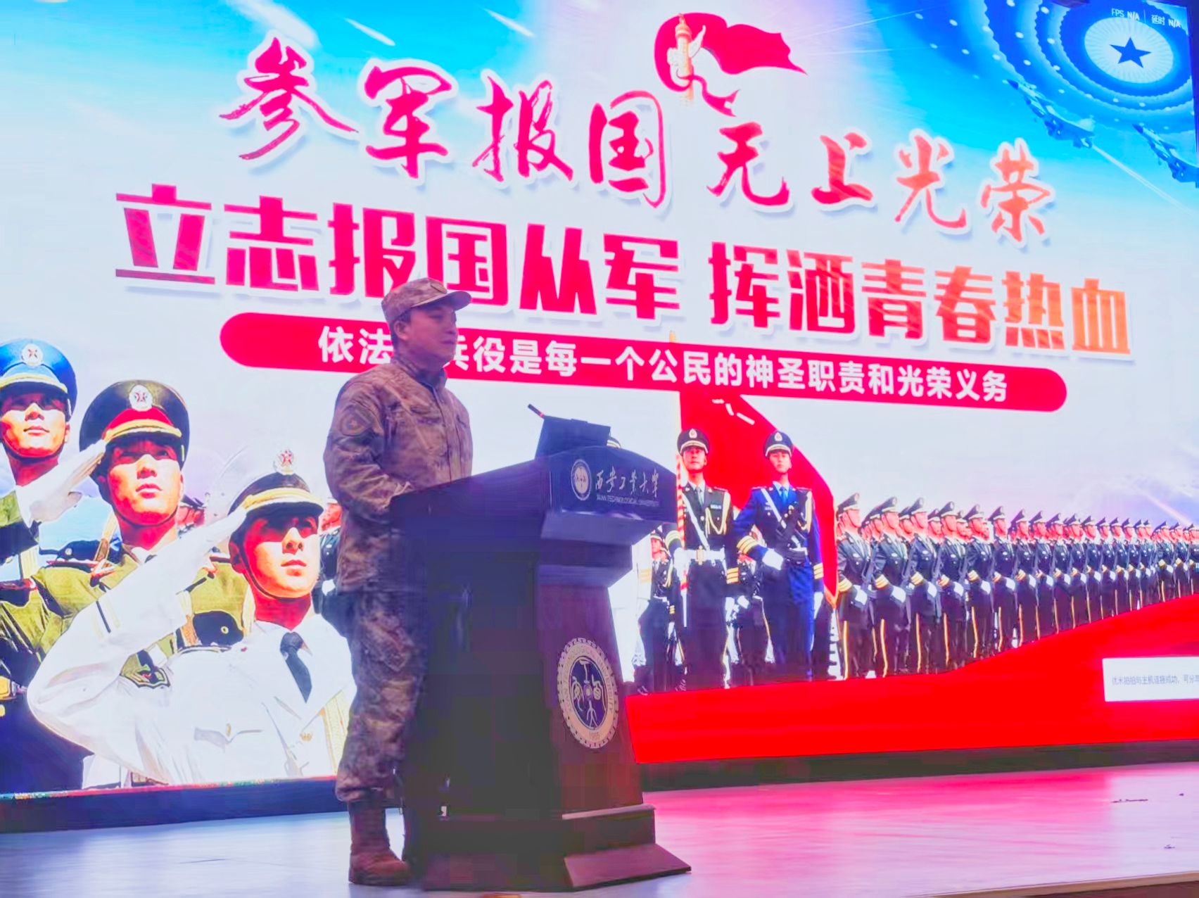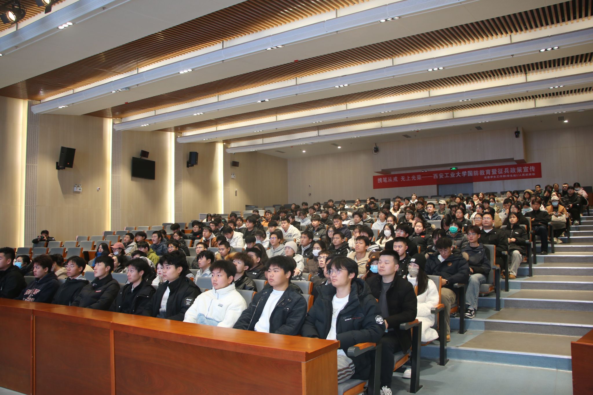 12月23日,西安工业大学党委学生工作部(学生处)/人民武装部开展“携笔从戎,无上光荣”国防教育暨2026年征兵政策宣传活动。未央区人民武装部政治工作科科长张玉成应邀做主题教育和政策宣讲,设计学院2022级退役学生陈圆分享了自己的从军收获和感悟,300多名学生参与了活动。